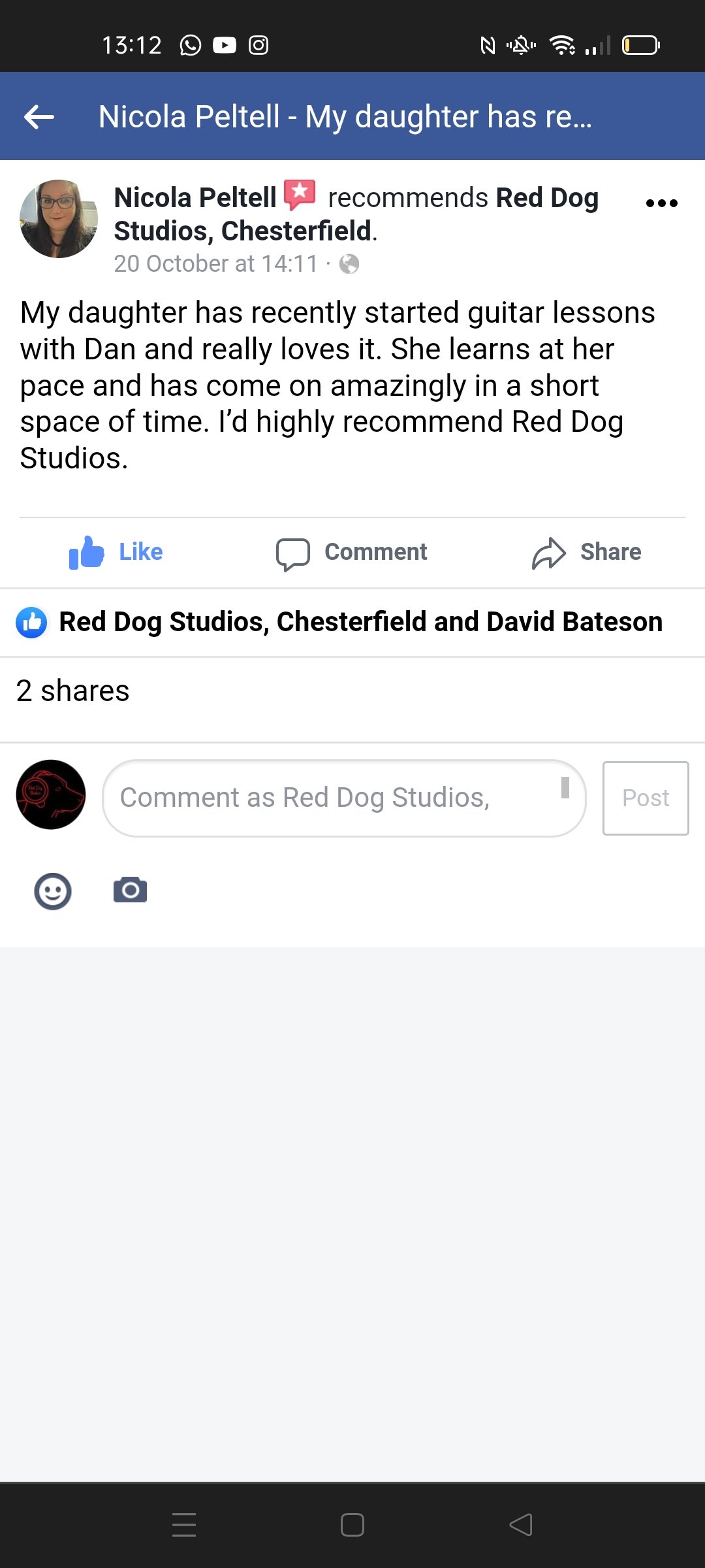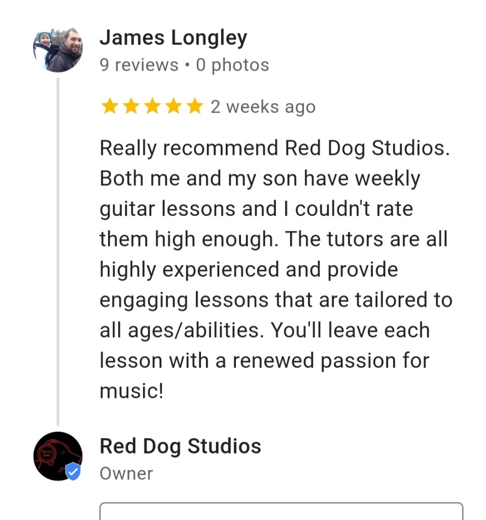 Brilliant guitar tuition, studio and owner! Known Mike for several years–inspirational teacher who has worked incredibly hard to get Red Dog Studios up and running. Very highly recommend.’February 2020 Gary Lynch