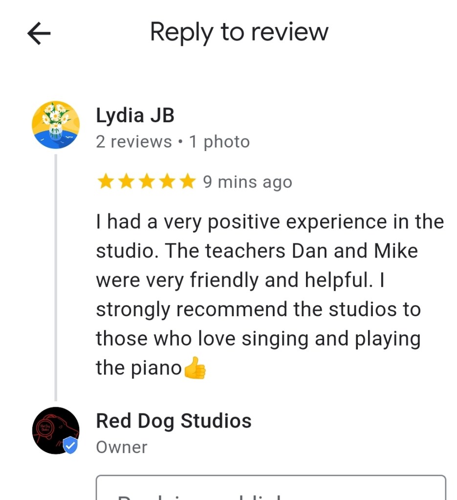 “Mike is a fantastic teacher and has a brilliant way of explaining things no matter your level of musical knowledge. I would highly recommend Red Dog Studios whether you are a beginner or advanced musician. Keep up the good work.”October 2019 Jay Logan