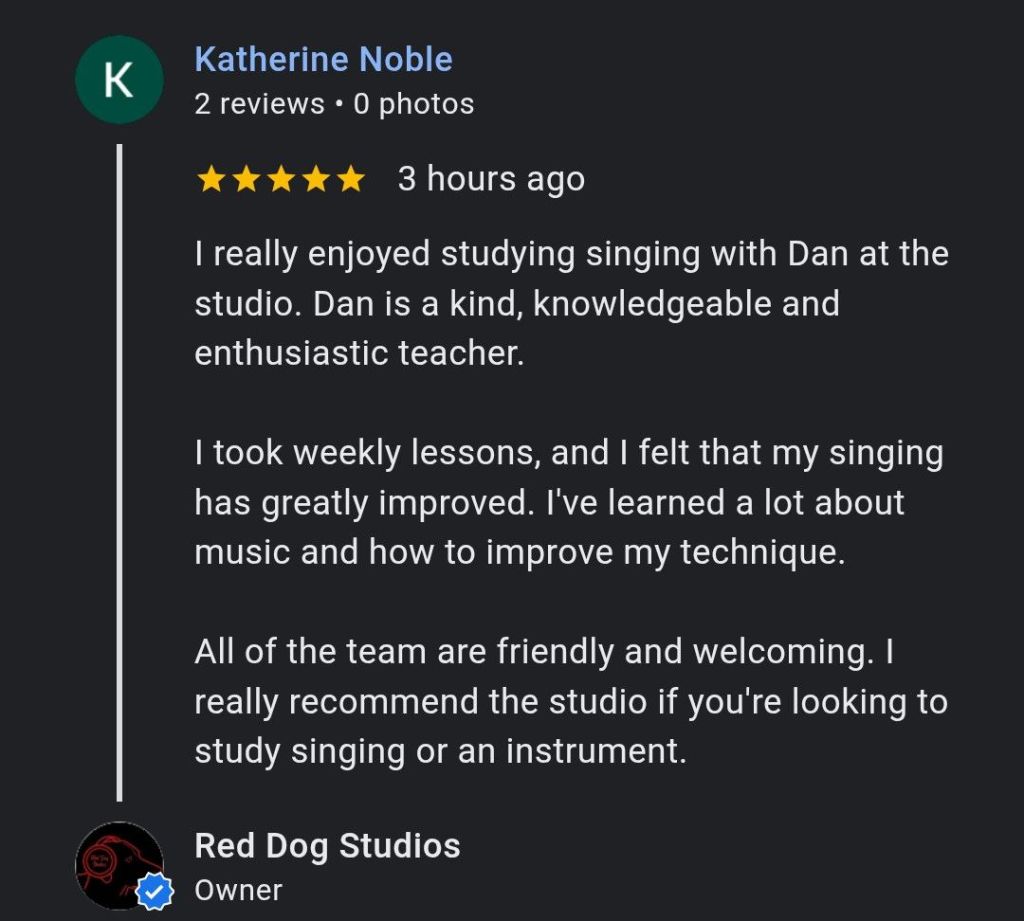 “Mike is a fantastic teacher and has a brilliant way of explaining things no matter your level of musical knowledge. I would highly recommend Red Dog Studios whether you are a beginner or advanced musician. Keep up the good work.”October 2019 Jay Logan